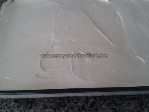 Şimdi fırından çıkardığınız kekin üzerine bir buçuk su bardağı sütü dökün. Arkasından krem şantiyi kekin üzerine kalınca bir tabaka şeklinde yayın ve üzerini düzleyin. Sonra da çikolata sosunu krem şantinin üzerine dökün.