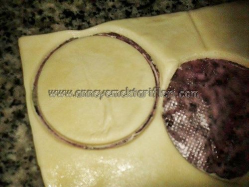 Önce milföy hamurlarını masaya dizin. çikolata dolgulu milföyler için Sonra da bunları ikişer parçaya ayırın.Ve bardakla kesin Bir fırın tepsisine yağlı kağıdı yayın ve kestiğiniz 12 parça hamuru tepsiye dizin. Hamurların üzerine toz şekeri dökün. Şekerin miktarını vermedik, bu sizin ağız tadınıza ve şekere bakış açınıza göre değişebilir.
