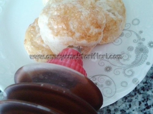 Bu arada fırında pişen milföyleri alın ve biraz soğumasını bekleyin. Şimdi yapılması gereken şey, hazırlanan erimiş çikolatayı, milföy hamurlarının içine koymak. Bunun için iki yol var. Ya bir bıçak kullanarak hamurları üstten aralayın ve erimiş çikolatayı içine dökün. Ya da bir sıkma aparatı kullanarak ince ucuyla hamurun içine erimiş çikolatayı sıkın.
