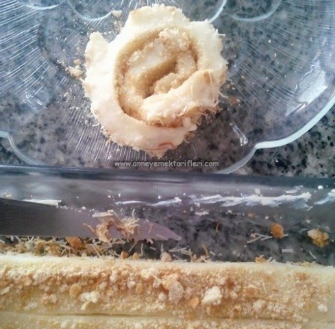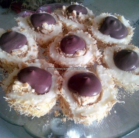 Fındık parcalarını da kadayıfa karıştıralım ve üzerine hazır olan tavuk göğsü muhallebisini yayalım bisküvilerimizi robottan geçirerek ezelim toz haline gelince kadar bisküvileri muhallebinin üzerine yayalım. Ve tatlımızı dolapta yaklaşık 30 dakika kadar dolapta bekletelim.