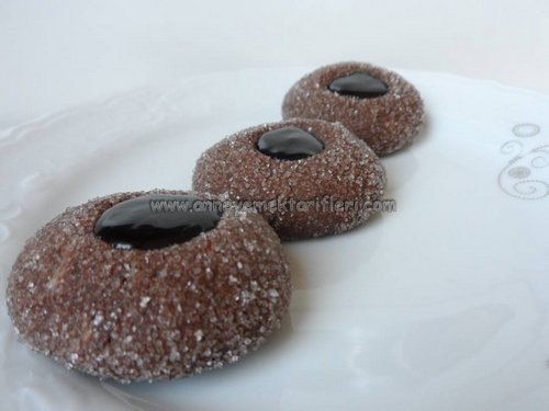 Dikkat edelim delinmesin sadece bastırıp bırakalım ve önceden ısınmış 180 dc fırında 2- ila 30 dakika arası kontrollu şekilde pişiriyoruz. Pişen kurabiyeleri fırından alarak soğuduktan sonra üzerlerindeki açtığımız çukurlara çikolata sosu doldurup kurabiyeleri hazır hale getiriyoruz ve servis yapıyoruz..Işıl ışıl kurabiyelerimiz göz dolduran güzelliğiyle yenmeye hazır afiyet olsun…