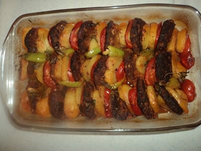 4 adet patates 2 adet domates 2 adet sivri biber 1 tutam maydonoz salca tuz karabiber su Yapılışı: önce köftemizi yoguruyoruz daha sonra tavada kızartıyoruz patateslerimizi halka halka dograyıp onlarıda kızartıyoruz sonra tepsimize patatesleri köfteleri domates ve biberleri sırayla diziyoruz 1 su bardagı suyla salca karabiber ve tuzu karıştırıp yemegimizin üzerine döküyoruz en son maydonozları gezdirip fırına veriyoruz patetesin ve köftenin üzeri kızarana kadar pişiriyoruz afiyet olsun
