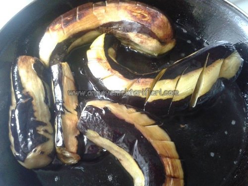 Şimdi tavaya bir miktar zeytinyağı koyun ve kızdırın. Yağ kızınca da patlıcanları kızartmaya başlayın. Fazla yakmadan patlıcanları kızartın. Sonra da kızaran patlıcanları bir kaba koyun.