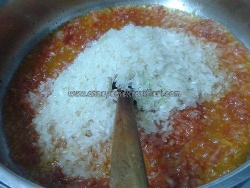 Yıkanmış süzülmüş olan pirincimizi soğan ve salça karışımına ekleyerek hafifçe kavuralım ve baharat ve tuz ilave ederek yarım çay bardağı da su ilave edip 5 dakika kadar pişmesini bekleyelim ve suyu çekince kapağını kapatıp biz yapraklarımızı hazırlayalım.